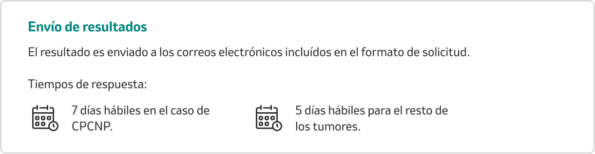 En el caso de CPCNP usted recibirá el resultado en 7 días hábiles a partir de la recepción de la muestra en el laboratorio, mientras que para el resto de las indicaciones el tiempo será de 5 días hábiles.